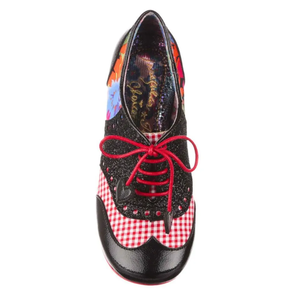 This Iconic Style Is Back Once More, This Time In Sparkly Glitter And Bright Florals! A Colourful Abstract Floral Pattern Covers The Sides, In Shades Of Pink, Blue And Orange. The Mid Heel And Toe Are Covered In Gorgeous Deep Black And The Red Sole Matches The Red Gingham On The Toe And Tongue, And Black Glitter Upper. Finished With Sweet Glitter Black Hearts At The End Of Red Laces, Grab Yourself A Pair Today!