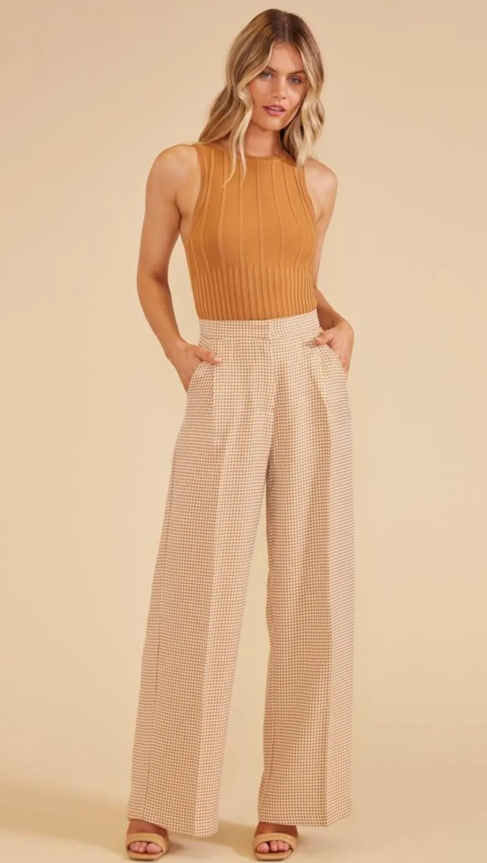 - In A Tan And White Houndstooth, The Kennedy Wide Leg Pants Balance Style And Comfort, With Their Relaxed, Wide-Leg Silhouette, Front Pleats And Functional Pockets.