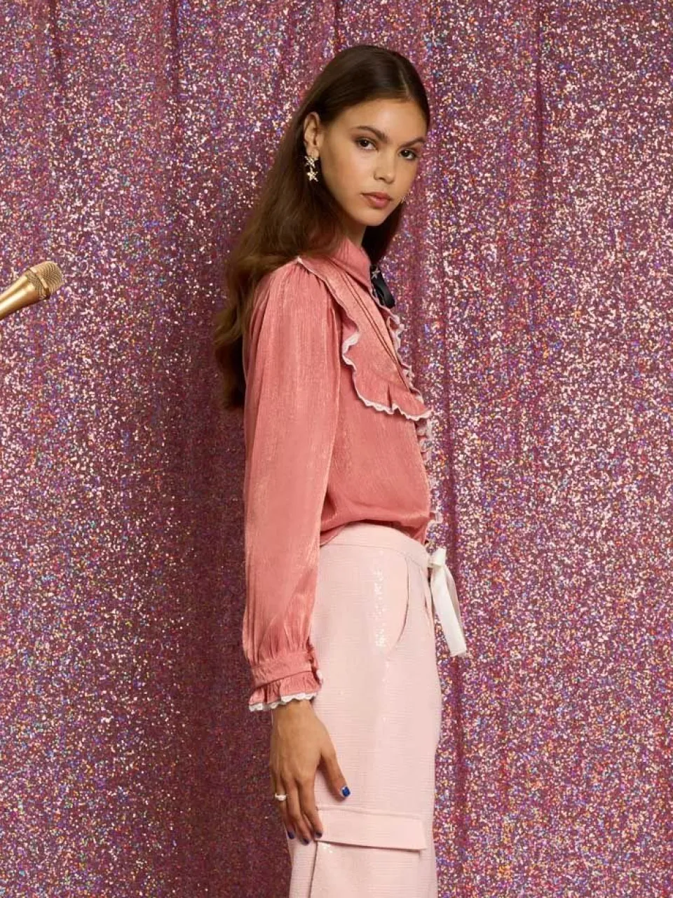 Indulge In The Harmonious Elegance Of The Melody Ruffle Blouse. This Regular-Fit Blouse, Crafted From A Shimmery Woven Fabric, Captures The Essence Of A Sweet Serenade. Its Distinctive Charm Lies In The Contrast Lace Trim, Adding A Touch Of Textural Allure To Your Ensemble. Wearing This Blouse, You Become The Embodiment Of A Timeless Melody, Ready To Grace Any Occasion With Your Poise And Grace.