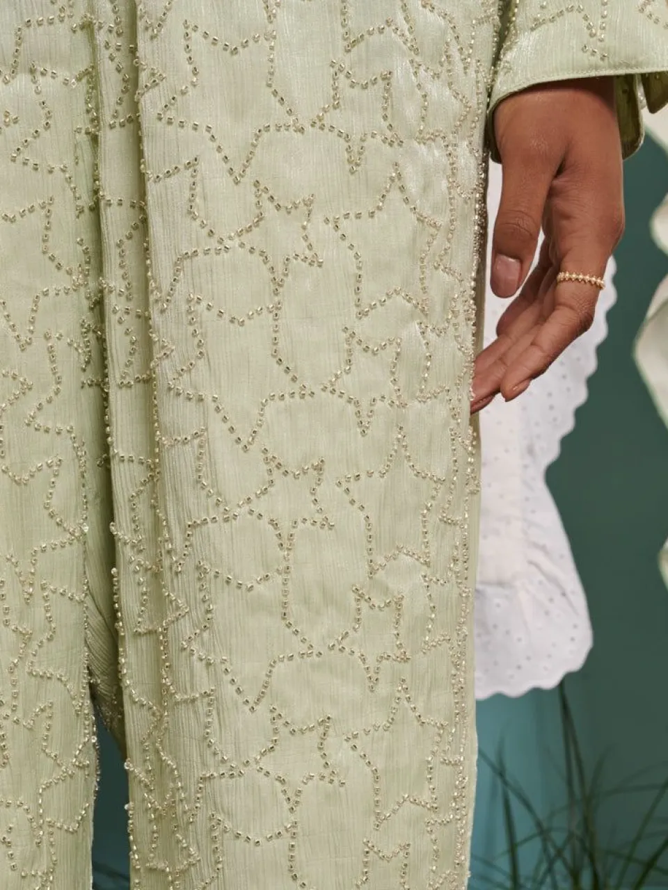 These Trousers Have You Feeling On Top Of The World; The Star Bead Embellishment Shimmers On The Sage-Green Crinkle Fabric Like No Other. A Dreamy High-Waist Fit Is A Comfy Welcome To Your Wistful Weekend Wardrobe…