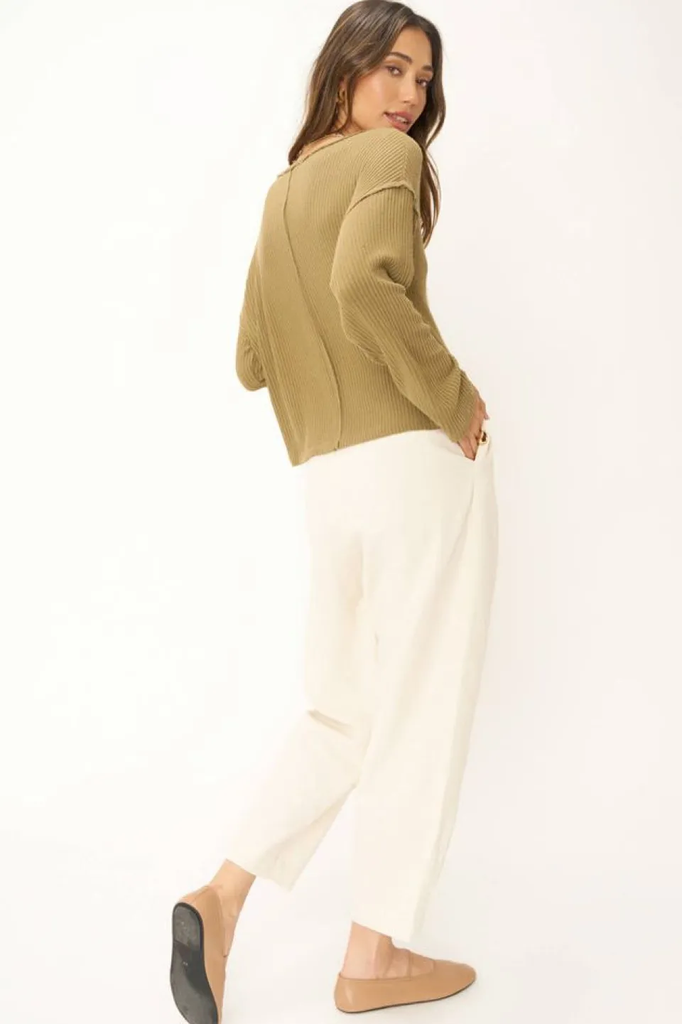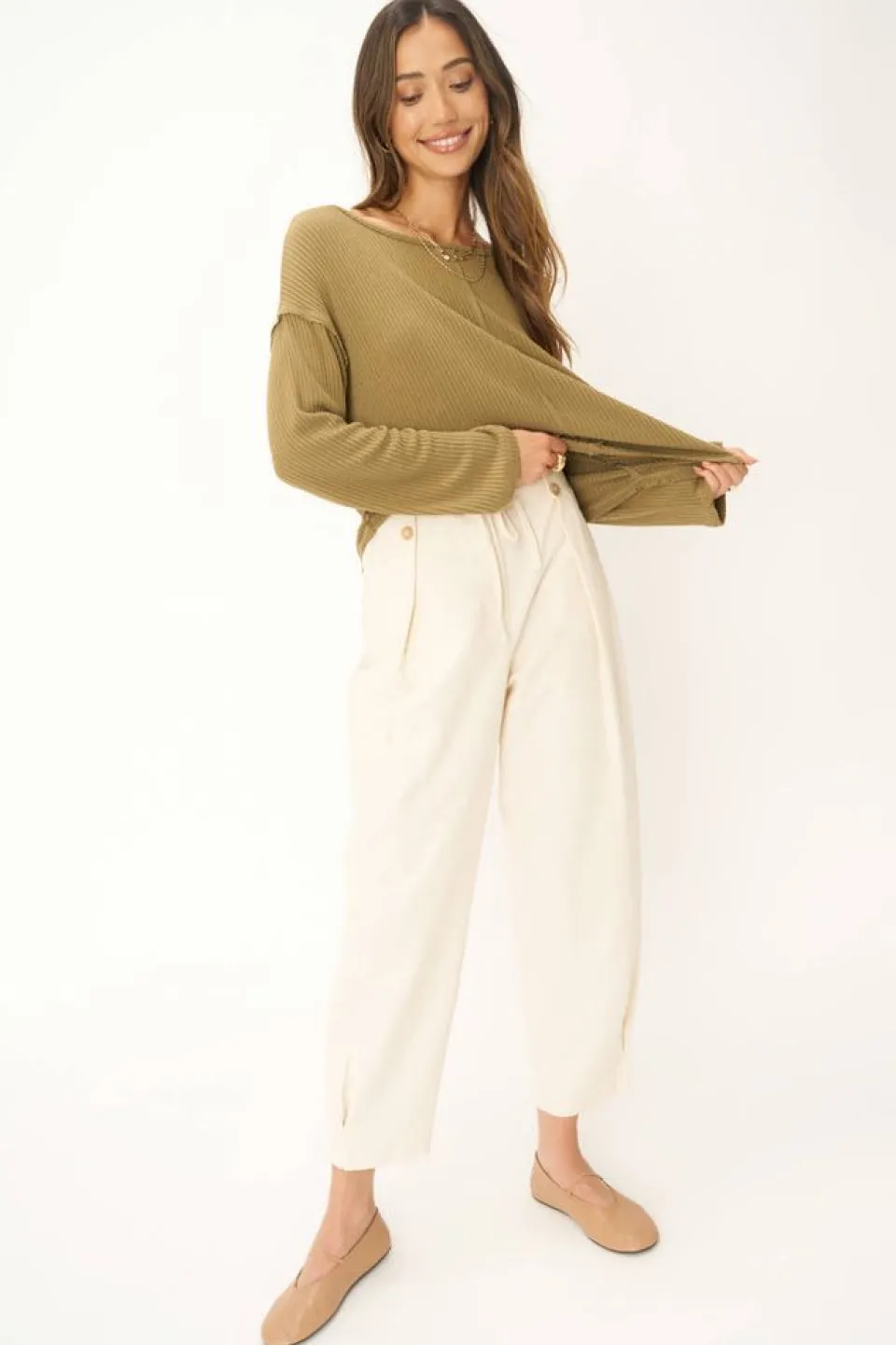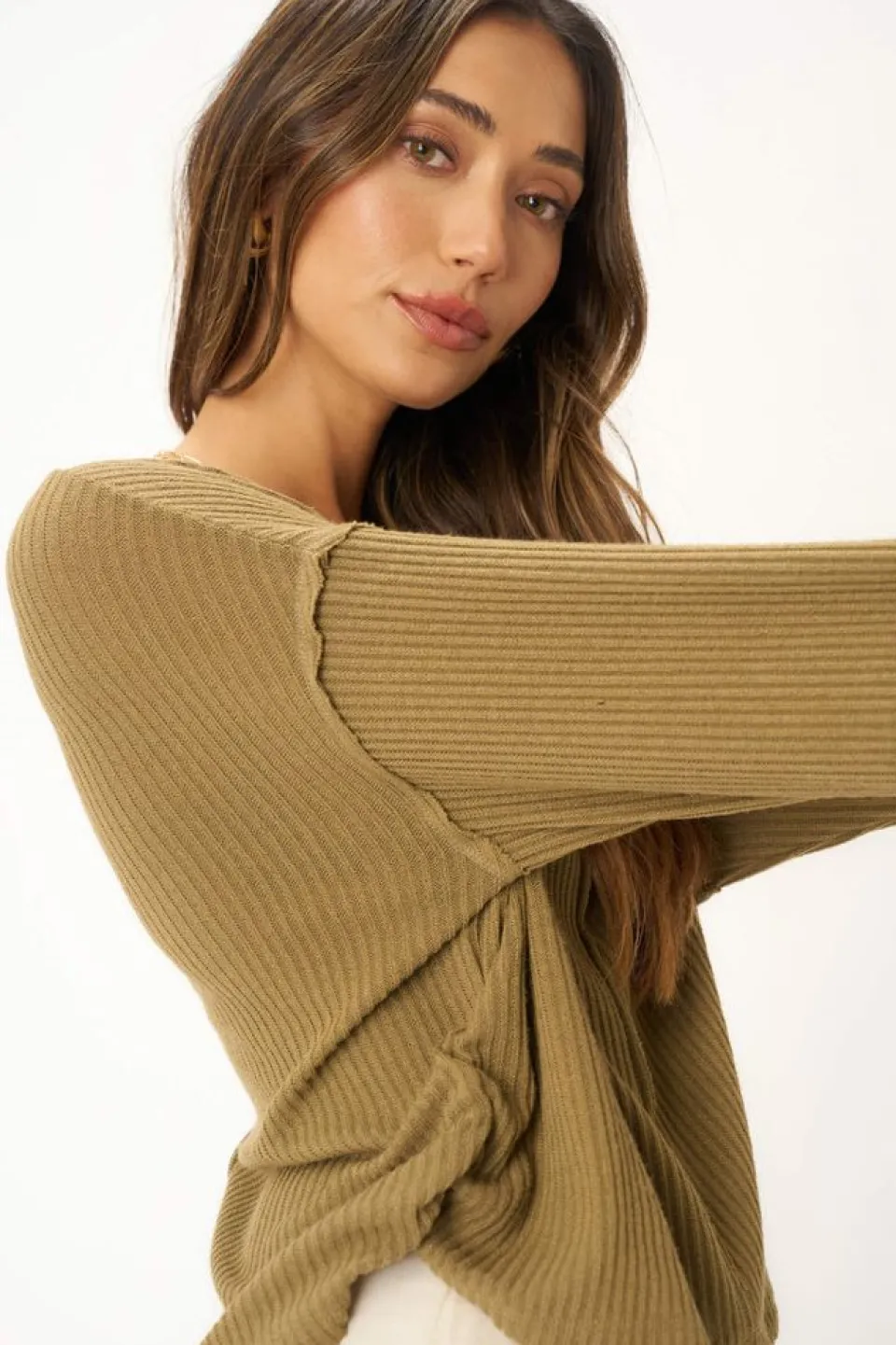 The Get It Right Textured Rib Long Sleeve Features Some Of Our Signatures Here At Pst: Textured Rib Fabrics, Comfortably Relaxed Fits, And Raw Edge Details. This Lightweight Sweater Fabric Drapes In All The Right Places, Perfectly Complementing The Relaxed Silhouette, Drop Shoulders, Side Shirring Details, And A Wide Crew Neckline. Pair With Cargo Pants And Heels For Girls Night Out.