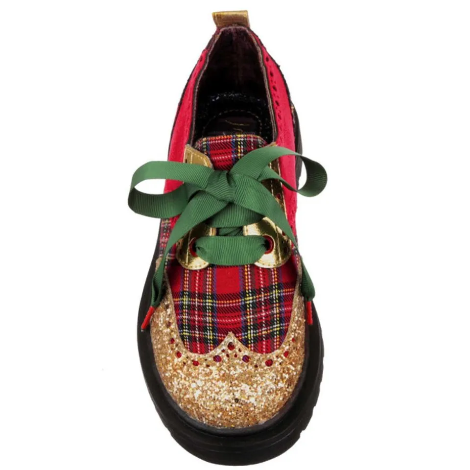 Take Your Christmas Look To The Next Level With These Tartan Chunky Flats. This Brogue Style Shoe Has Everything A Christmas Shoe Should. Plush Red Velveteen And Gold Leatherette Is Paired With Chunky Glitter And Finished With Chunky Green Laces. A Match Made In Heaven! Dress These Up Or Down For The Perfect Christmas Combo.