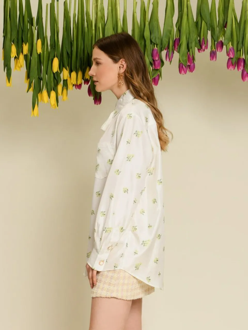 Sweet Serenity Claims You In This Floral Satin Jacquard Blouse. The Oversized Fit Invokes A Feeling Of Tranquillity And Statement Gold Buttons Offer A Hint Of Opulence. There’S Sophistication In The Removable Matching Necktie. This Is A Blouse For Any Occasion.