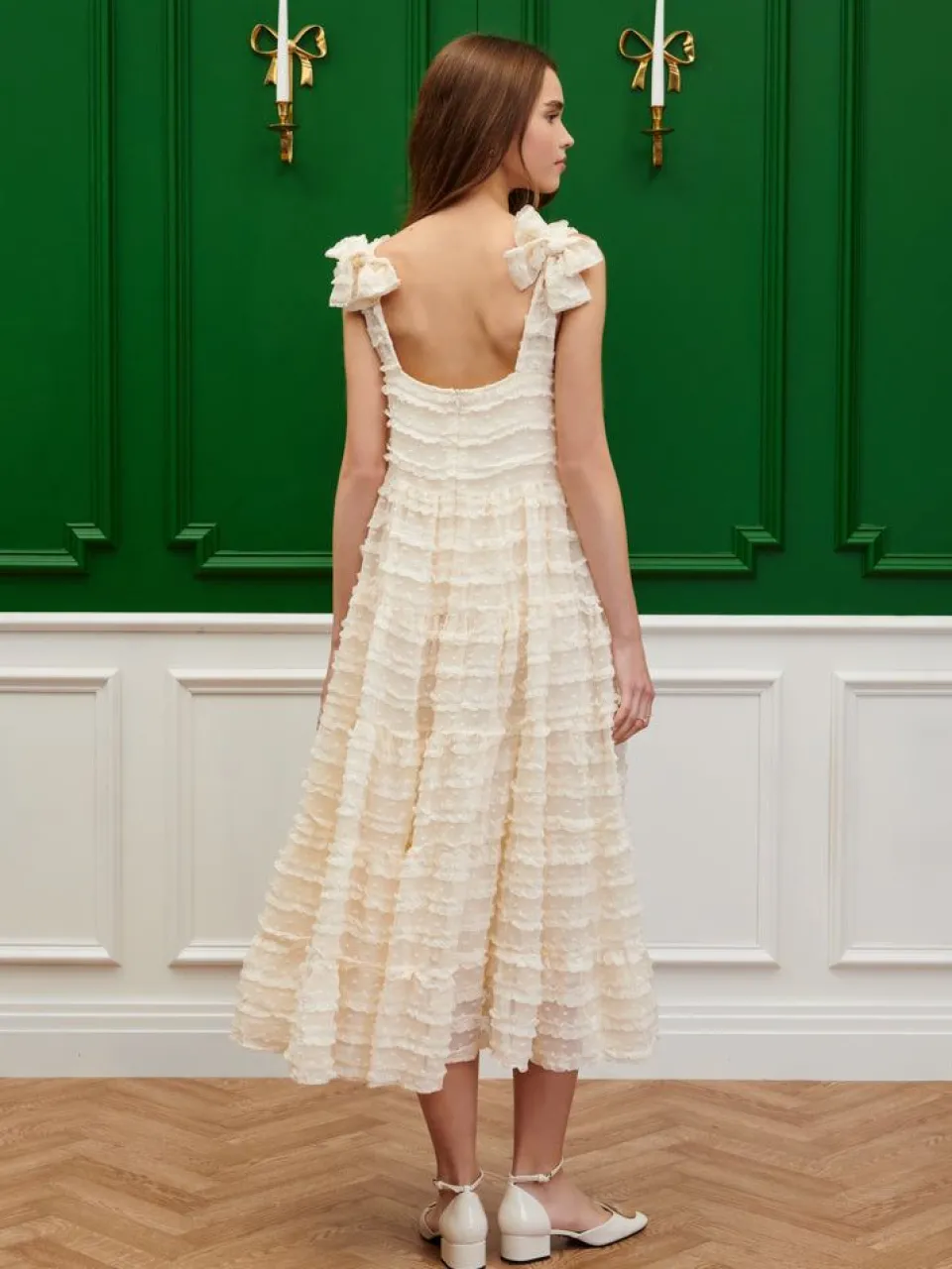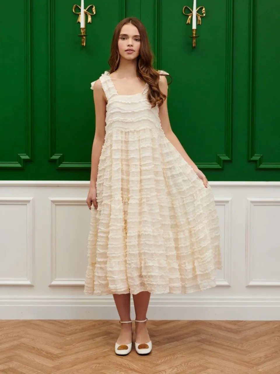 You Revel In The Riot Of This Killer Ball; This Midi Dress In A Dobby Spot Chiffon Always Brings Frock Fun. The Ruffle Stripes And Adjustable Shoulder Ties Were The Glamour Of Gratification. Fancy An After-Hour Stroll?