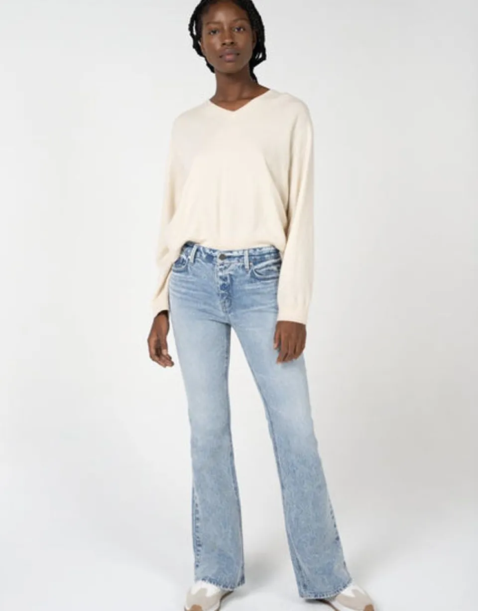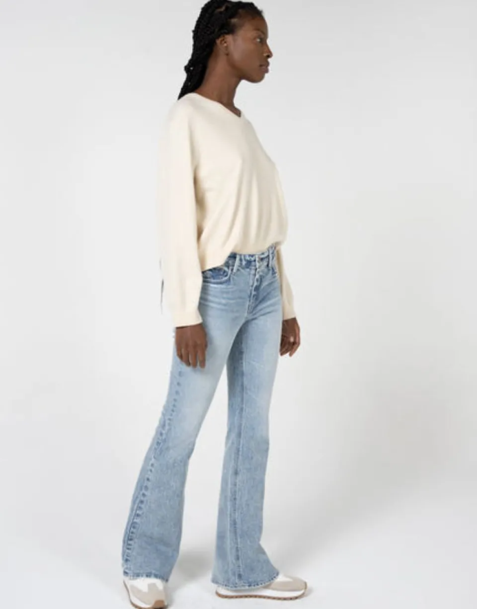 - Our High Rise Janet Will Give You Legs For Days. Made In Our Soft, Comfort Stretch Denim, This Style Hits At Your Natural Waist, Is Fitted Through The Hips And Thighs And Has A Classic Flare Leg Silhouette. Classic 5-Pocket Styling With A Button And Zip Fly Closure.
