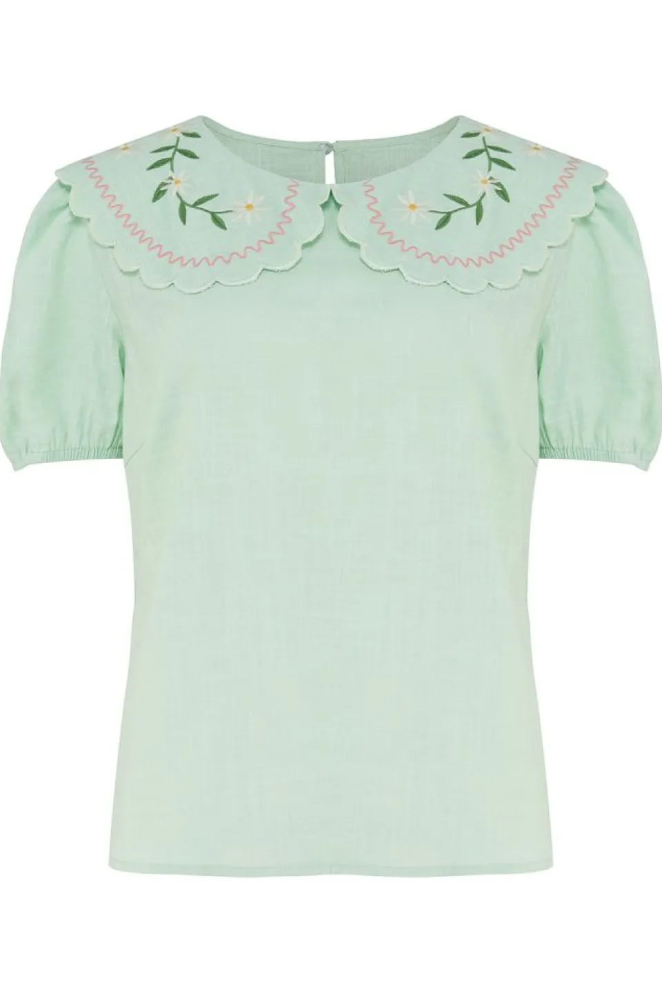 Beautiful Vintage Details Make This Top That Little Bit Extra Special. Cut With A Relaxed Fit, The Macie Has Short Puff Sleeves, An Oversized Scallop Edge Collar And A Keyhole Back Fastening. The Embroidered Daisies And Pink Decorative Stitching Give The Macie Top A Romantic Storybook Feel.