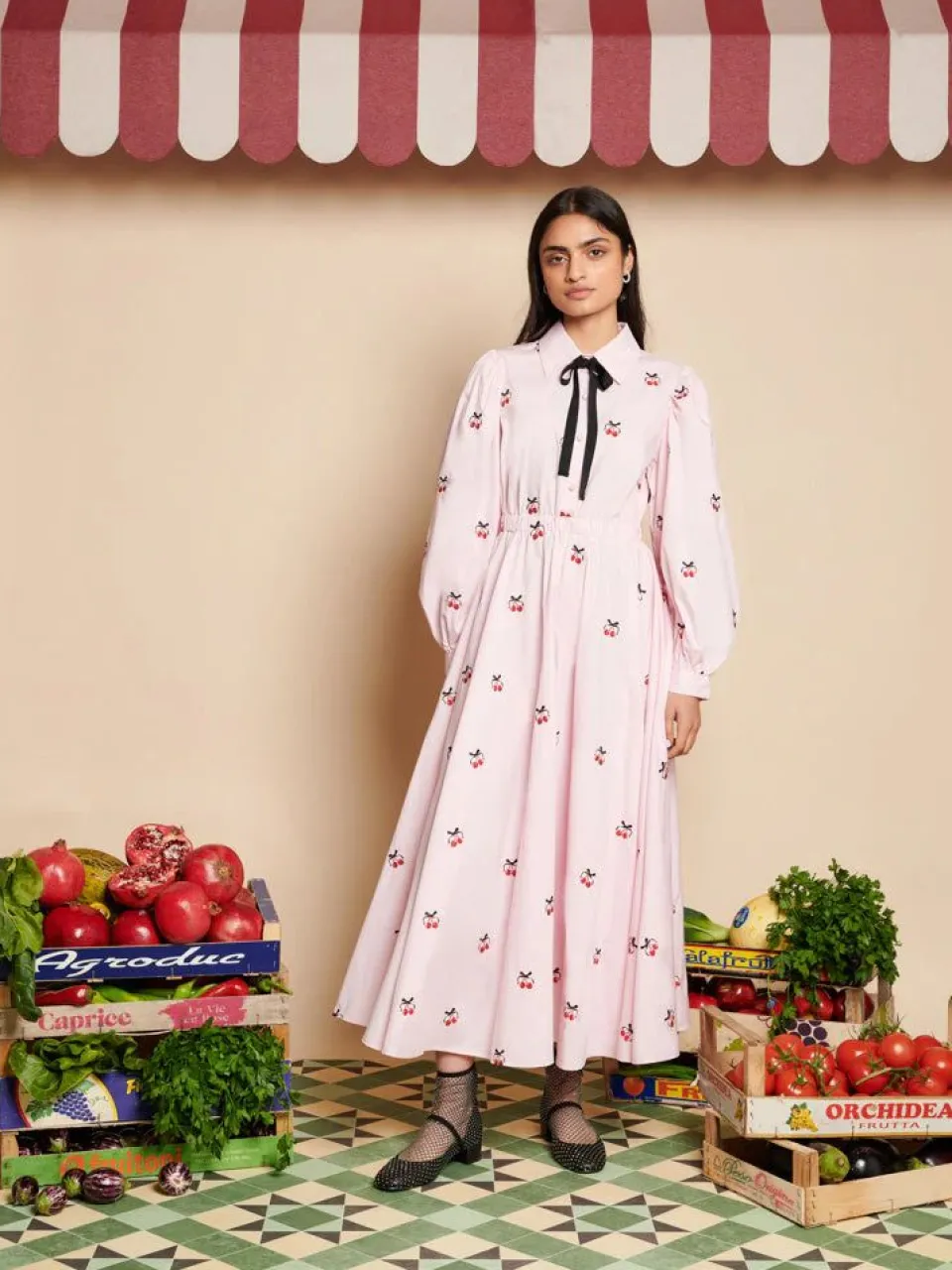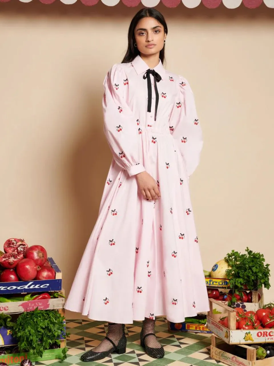 The Punnet Embroidered Dress Weaves The Essence Of Sun-Dappled Market Mornings Into Its Very Stitches, With Cherries Embroidered On Soft Cotton Fabric, Whispering Tales Of Spring’S First Bounty. Its Silhouette, Cinched Gently At The Waist, Flutters With Every Breeze, Mirroring The Dance Of Leaves In A Serene Orchard. A Contrasting Grosgrain Necktie Adds A Touch Of Sophistication, Like A Well-Chosen Accessory That Completes A Market Day Ensemble.