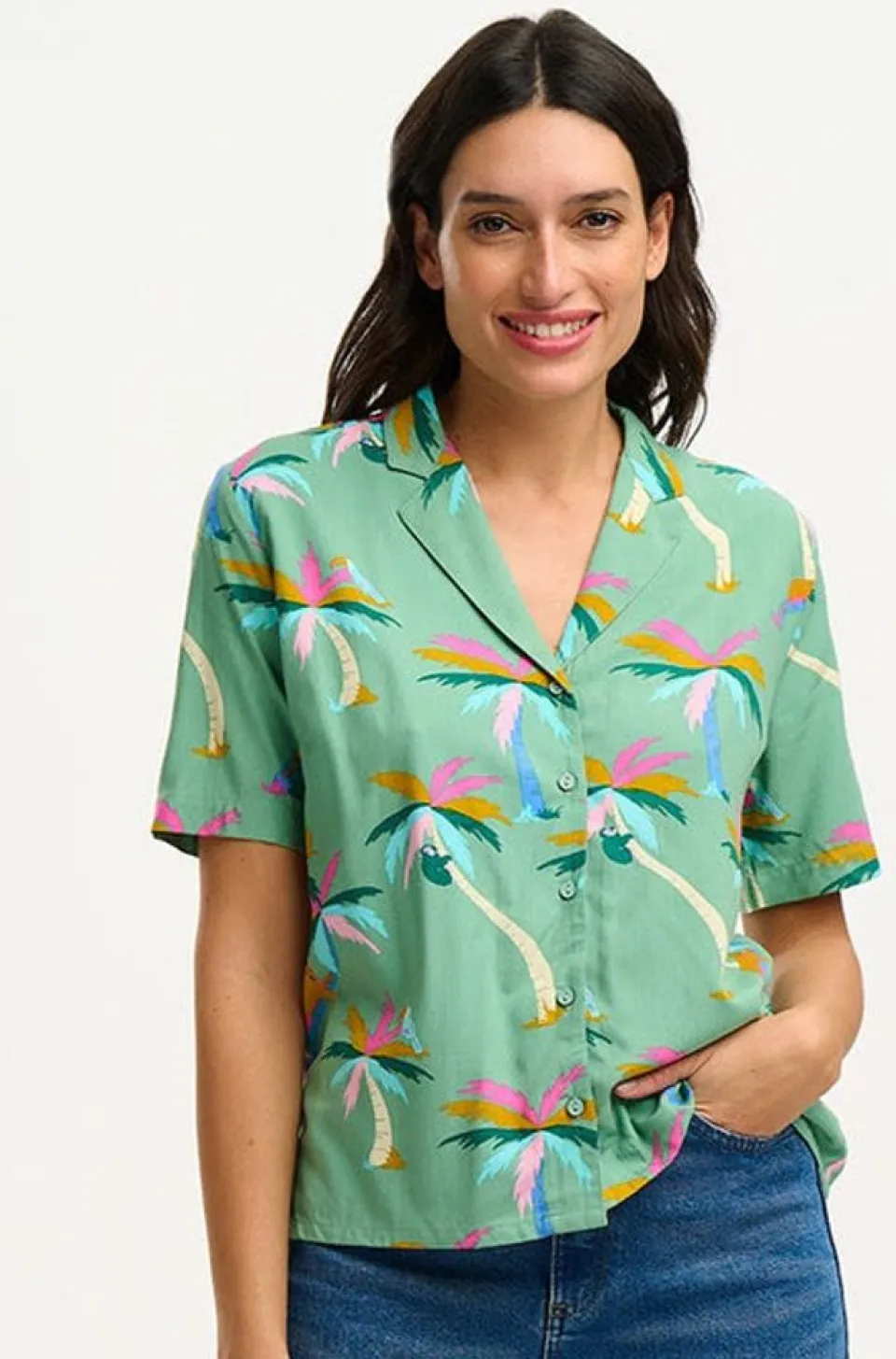 The Perfect Summer Staple Piece, Santana Is A Summery, Casual Shirt. Featuring A Revere Collar, A Relaxed Fit And Short Sleeves. Wear It With The Co-Ordinating Pieces Or Paired With A Simple Skirt Or Jeans For A Versatile Summer Look. The Rainbow Palms Print Features Pale Blue, Pink And Burnt Orange Palm Trees, On A Simple Green Base.