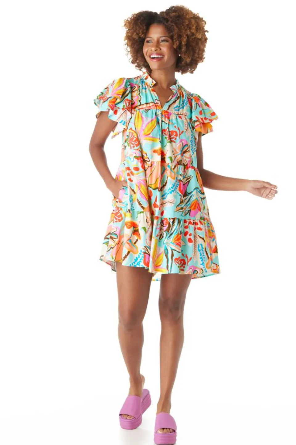 Mila Is A Must-Have Mini For The Warmer Months Ahead! This A-Line Dress Features A Tiered Skirt, Split Neckline With Ruffle Details, And A Stylish Double Flutter Sleeve.