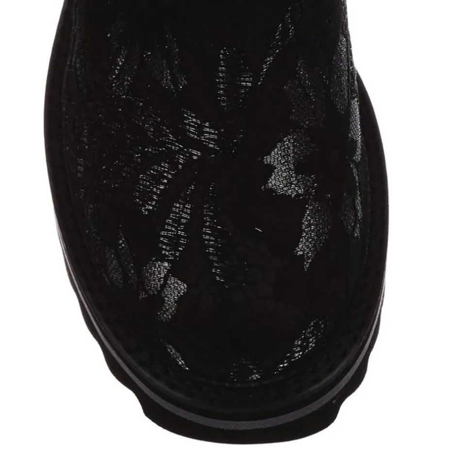 Perfect For Those Chilly Walks, These Boots Are Here To Infuse Some Fun Into Your Wardrobe For The Colder Months! Featuring A Super Chic Monochrome Floral Fabric, Accented With A Black Leather Texture And Matching Buckles – These Boots Are Sure To Take Any Outfit To The Next Level! The Chunky Tread Means That They Are Super Comfortable And Also Create A Great Impact When Worn! Perfect To Pair With Some Fun Tights Or Snazzy Trousers, Add Them To Your Life Today!