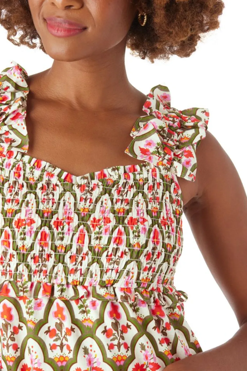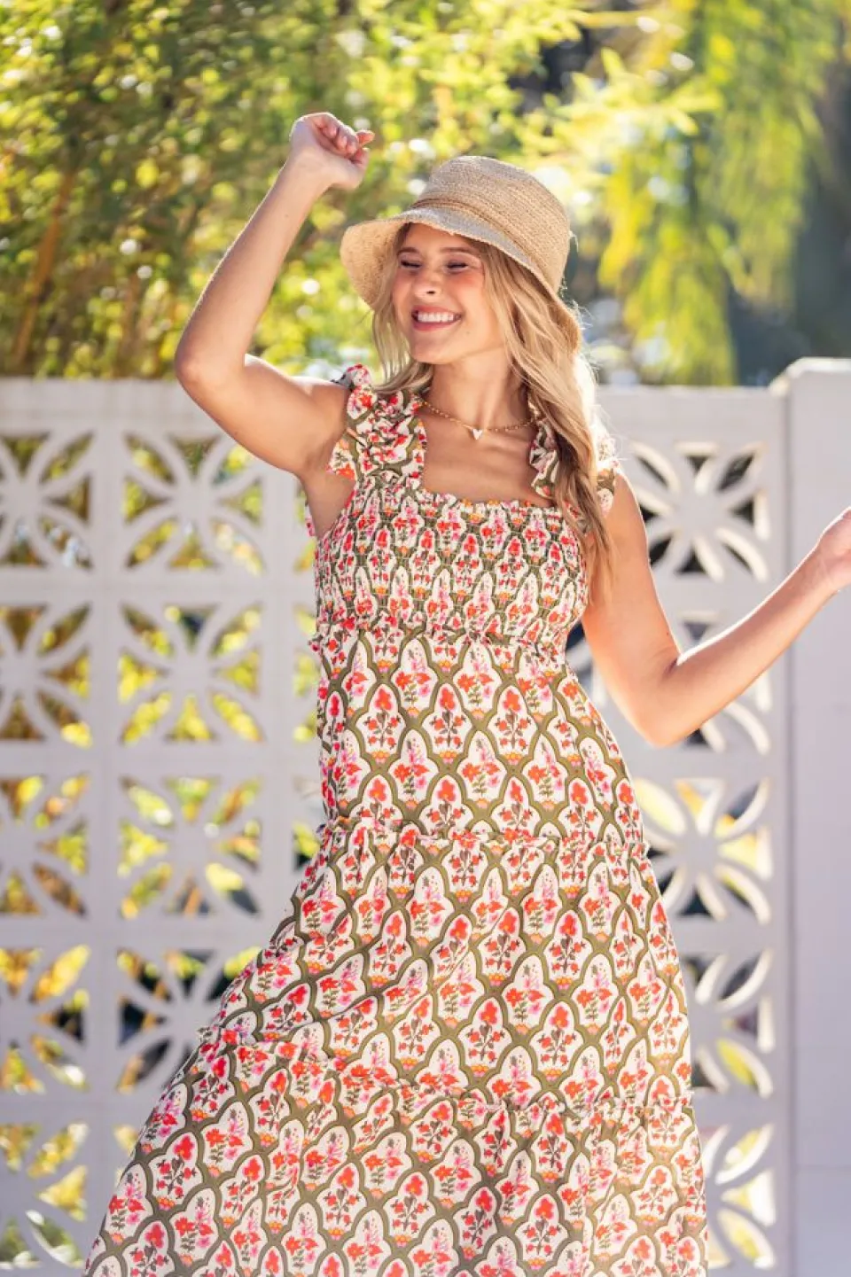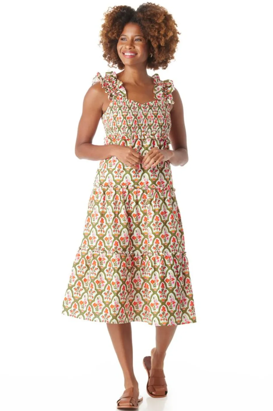 Meet Brayden, An Easy-To-Wear Closet Staple. She Is Midi-Length And Features A Sweetheart Neckline, Tiered Skirt With Ruffles, And Pockets (Of Course!). The Smocked Bodice Adds Versatility, Ensuring A Comfortable Fit Across Various Sizes.