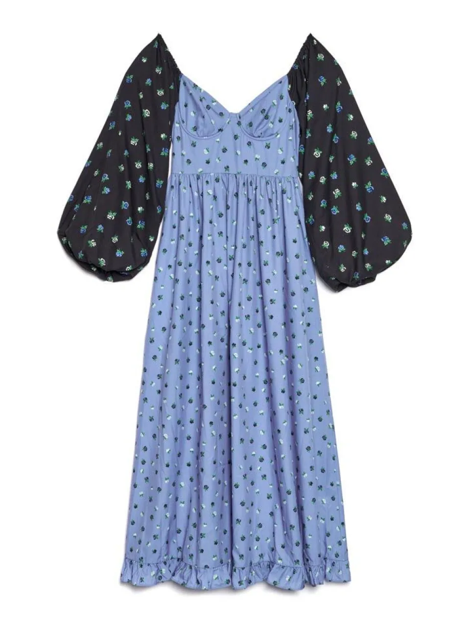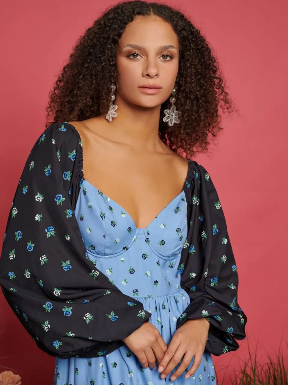 The Pastures Sing Amongst A Scattering Of Sky-Blue And Ditsy Florals. This Mixed-Colour Maxi Dress Is A Two-Tone Silhouette To Be Treasured. Flourish With A Fitted Waist And Flowing Skirt, Fastened With The Rodeo Gem Buckle Belt.