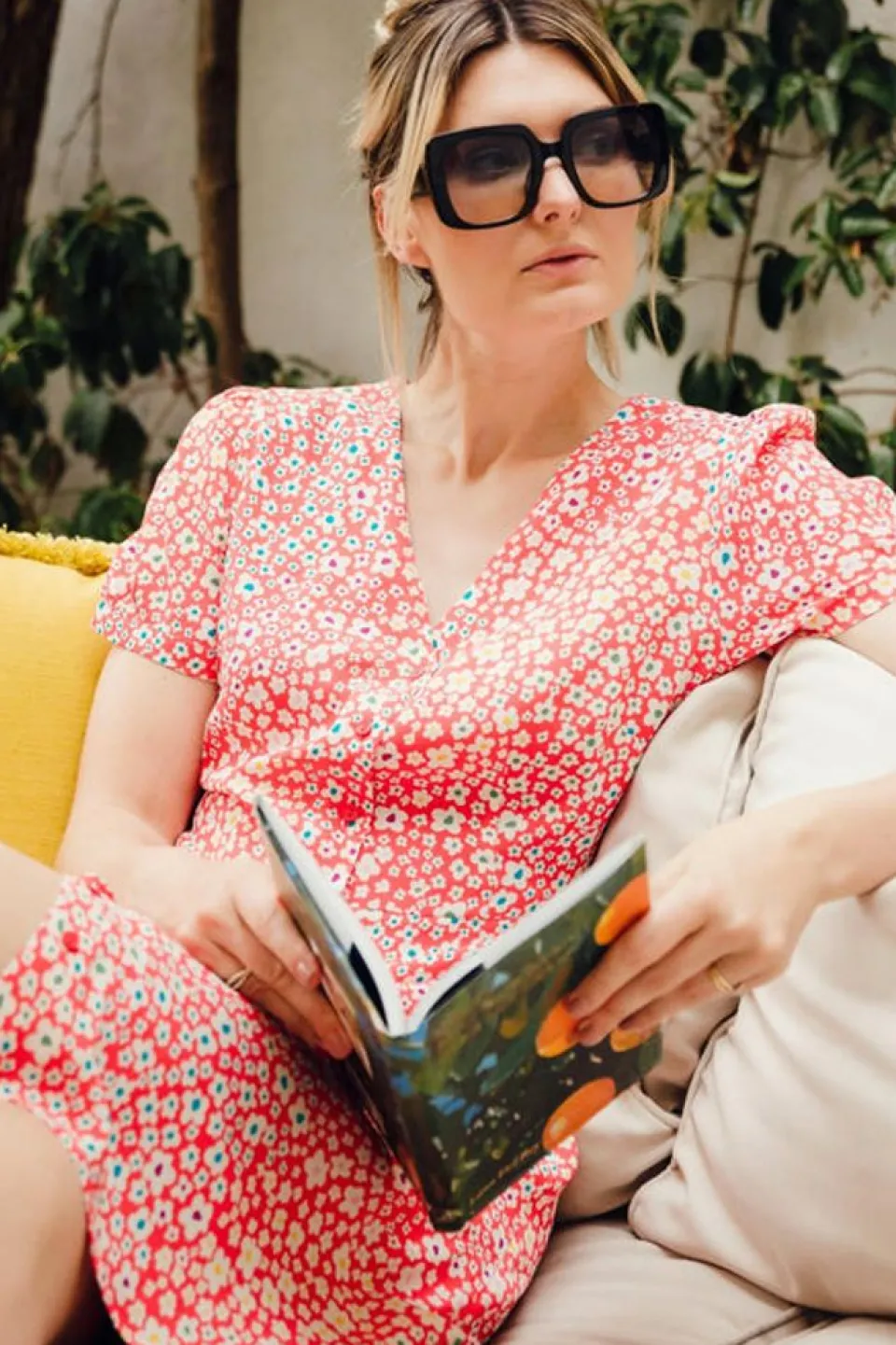 The New Gail Shape Is A Vintage Inspired Simple Tea Dress, With A Functional Button Front And A V Neckline And Flattering Puff Sleeves. This Dress Showcases Our Rainbow Infused, Red And Off-White Hand Painted Floral Print.